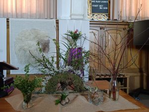Yn de skikking wurdt dat ek útbielde. Allerearst de basis fan de Geest dy’t útbylde is troch de foarm fan in waaier, en wêr’t no ek mear kleur ynkomt troch mear griene tûken en de Palmblêden as teken fan de feestlike yntocht.